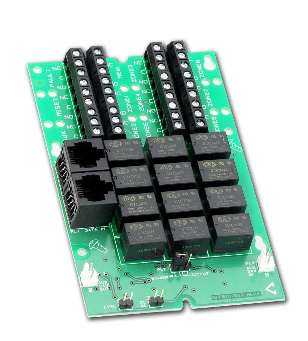 - Provides four panel-controlled volt free relay outputs (reset, fault, aux. fire and remote) and eight output per zone relays.